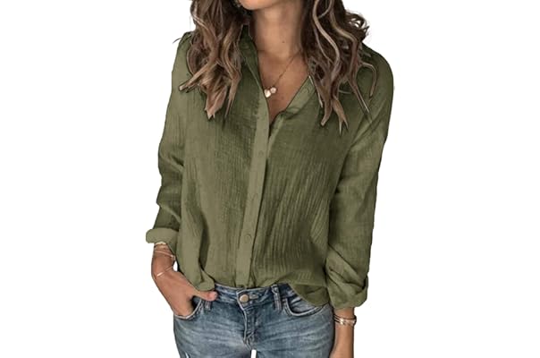 #1:Karlywindow Womens Long Sleeve Button Down Cotton Linen Shirt Blouse Loose Fit Casual V-Neck Tops